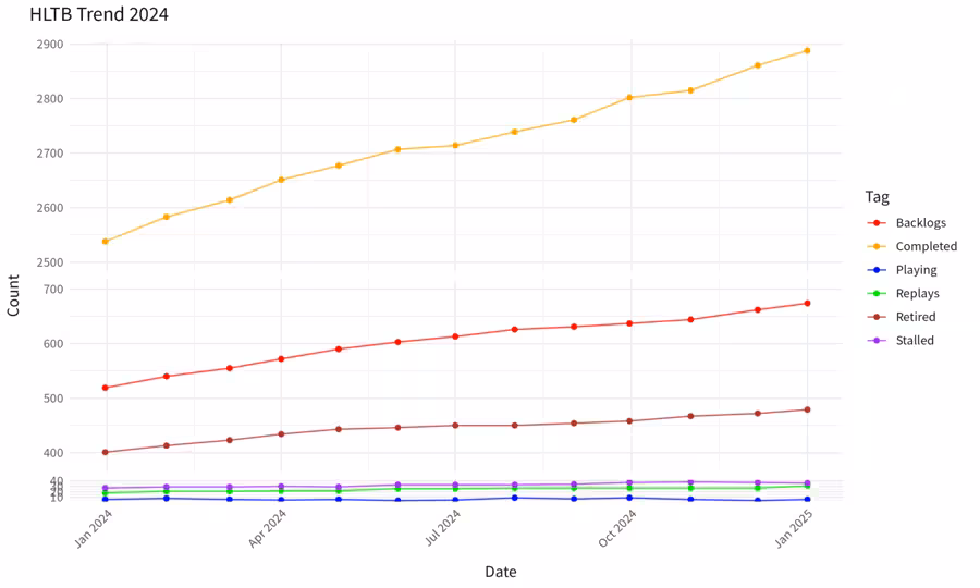 labs(title = "HLTB Trend 2024", x = "Date", y = "Count", color = "Tag") +